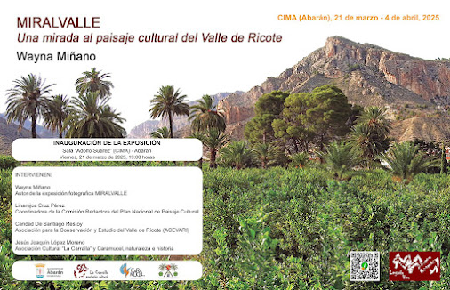 Inauguración de la exposición fotográfica de Wayna Miñano MIRALVALLE CIMA (Abarán), 21 marzo de 2025 La exposición fotográfica MIRALVALLE. Una mirada al paisaje cultural del Valle de Ricote muestra el resultado de la interacción entre poblamiento y medio natural en esta imponente comarca del sureste peninsular, que tiene parangón con algunos de los paisajes […]