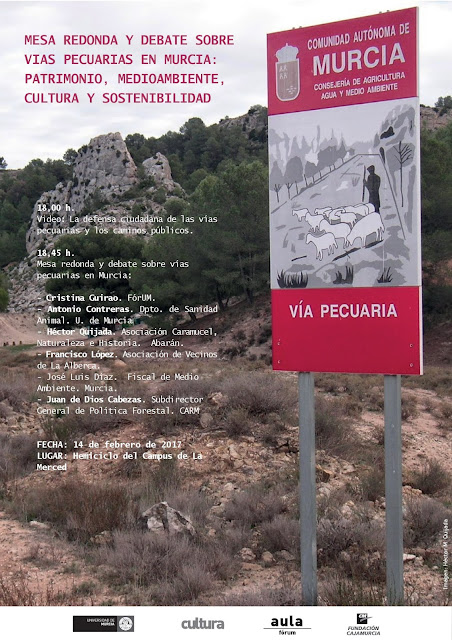 Vías pecuarias en Murcia: patrimonio, medioambiente, cultura, turismo y sostenibilidad. Aula de Fórum – Servicio de Cultura – Universidad de Murcia Hemiciclo del Campus de la Merced, 14 de febrero de 2017 Más información
