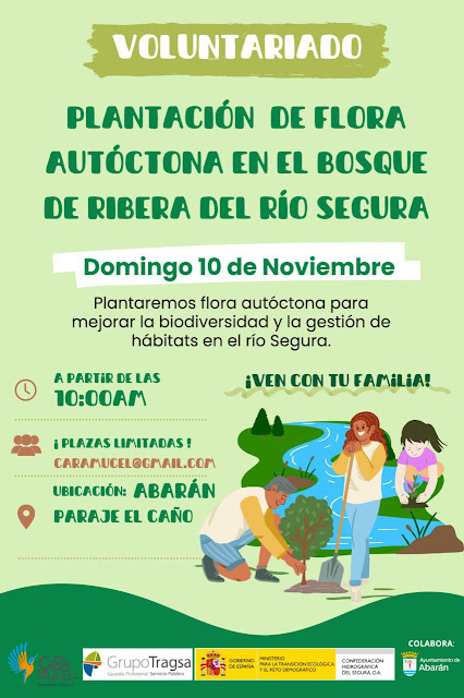 Desde la asociación Caramucel hacemos una nueva convocatoria de voluntariado para el próximo domingo día 10 de noviembre, con el fin de realizar una plantación de árboles y arbustos autóctonos para la mejora y recuperación del paraje de El Caño, en el entorno fluvial del río Segura en Abarán. Esta actividad se lleva a […]