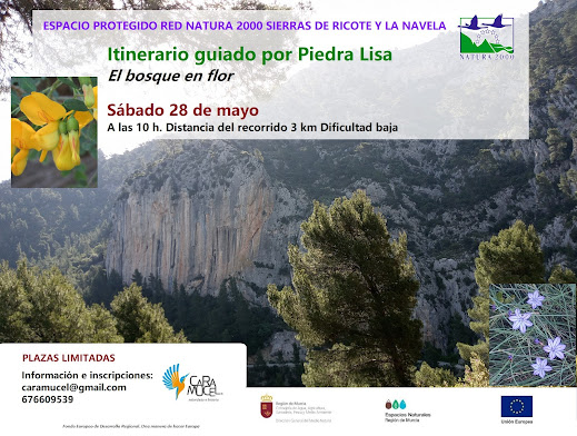 El próximo sábado 28 de mayo realizaremos un nuevo itinerario para dar a conocer el Espacio Red Natura 2000 de Sierras de Ricote y La Navela, dentro de las actividades puestas en marcha por la Dirección General del Medio Natural de la Consejería de Agua, Agricultura, Ganadería, Pesca, Medio Ambiente y Emergencias.